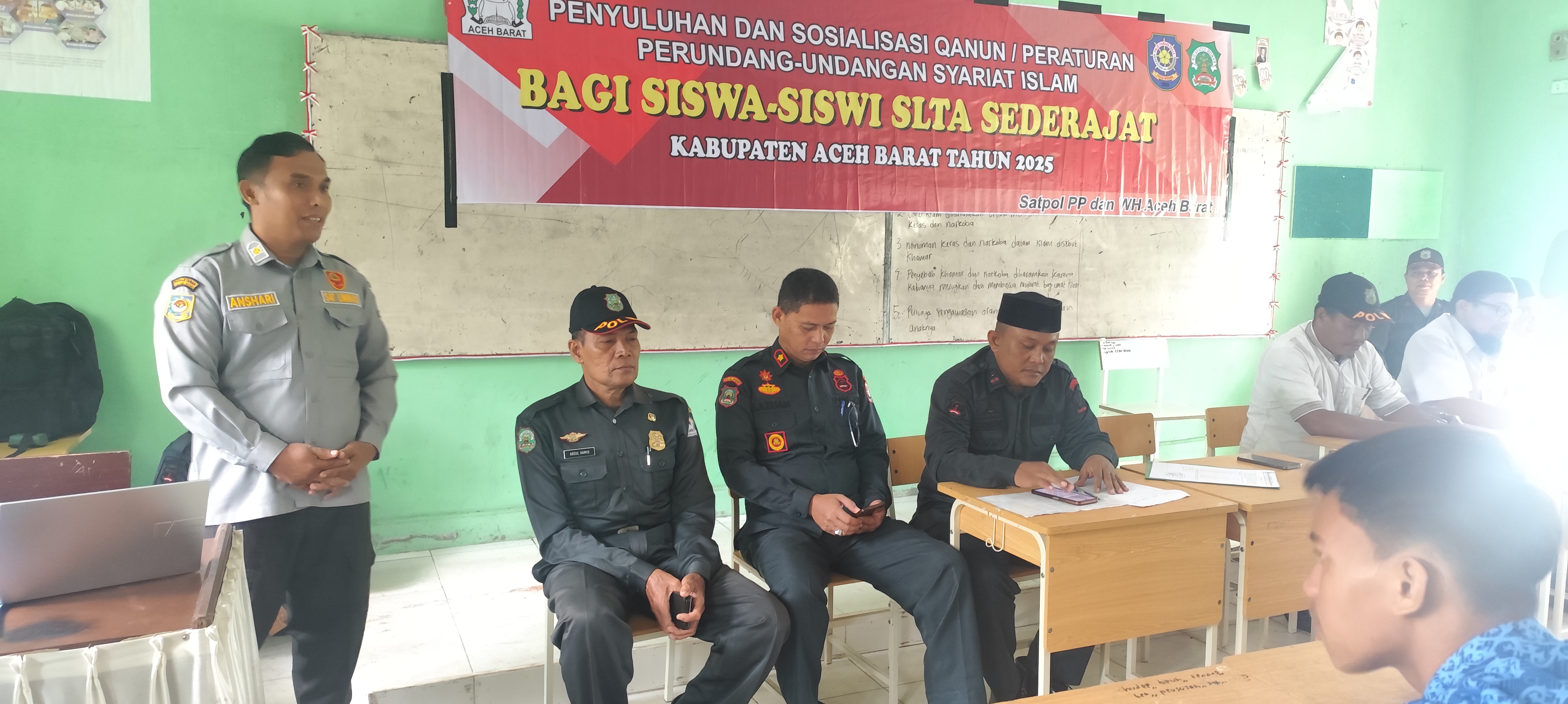 Pada kesempatan itu, pemateri dari Satpol PP dan WH menyampaikan akan pelanggaran qanun jinayat, meliputi, maisir, khamar, khalwat dan ikhtilat.