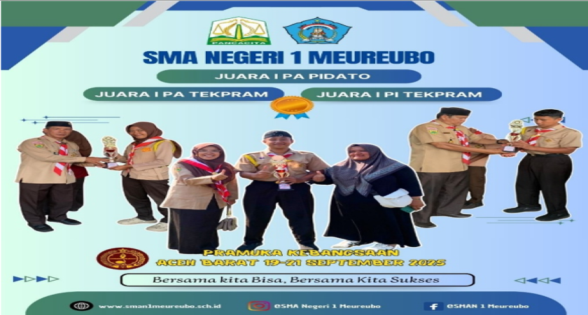 Siswa-Siswi SMAN 1 Meureubo Meraih Juara Dibeberapa Cabang Salah Satunya, Juara I Pa Pidato Oleh (Sulthan Afril Utama) Juara I PA Tekpram yang merupaka Lomba Kelompok diwakilkan oleh (Khairil Fitra) Juara I PI Tekpram (Hotma Rohani Putri).